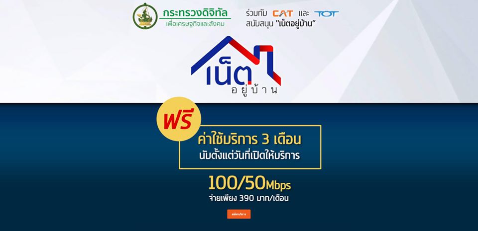 โดยได้รับความร่วมมือจาก บริษัท กสท โทรคมนาคม จำกัด (มหาชน) และ บริษัท ทีโอที จำกัด (มหาชน) ในการสนับสนุนบริการอินเทอร์เน็ตบรอดแบนด์ประจำที่ (Fixed Broadband) แพ็กเกจ “เน็ตอยู่บ้าน” ความเร็ว 100/50 Mbps ให้กับประชาชนที่ยังไม่มีอินเทอร์เน็ตบ้าน